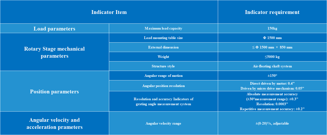 The high-precision turntable, as an important test equipment in aerospace and aviation projects, is mainly used for camera parameter calibration. The high-precision one-dimensional turntable developed by CGSTL has a maximum load capacity of 150 kg, an angular measurement accuracy better than + 0.3", and features high repetitive positioning precision and precision maintenance capabilities, ensuring continuous operation of the rotary stage and meeting the calibration needs of high-resolution, large-aperture, and long-focal length cameras.